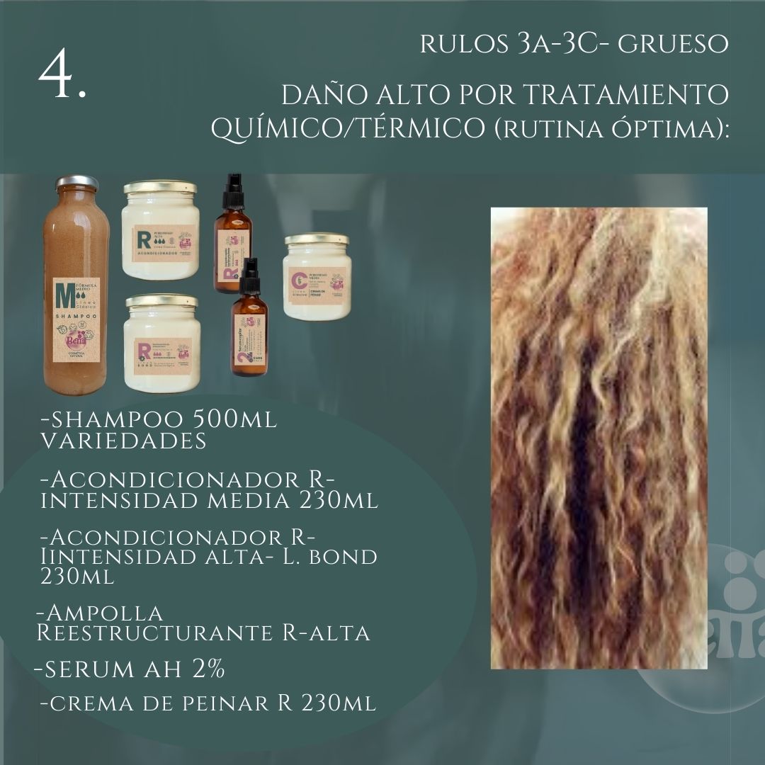 - 4. Cabello CURLY GRUESO DAÑO ALTO TRATADO: Shampoo 500ml (elige variedad) + Acondicionador R Línea Clásica 230ml + Acondicionador R Línea BOND 230ml + Ampolla Reestructurante R + Serum AH 2% + Crema de peinar R 230ml.