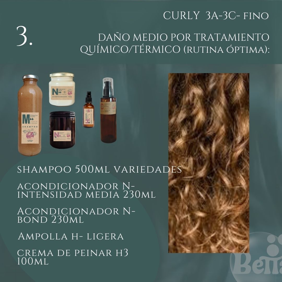 - 3. Cabello CURLY FINO DAÑO MEDIO TRATADO: Shampoo 500ml (elige variedad) + Acondicionador N Línea Clásica 230ml + Acondicionador N Línea BOND 230ml + Ampolla Reestructurante H + Crema de peinar H3 100ml.
