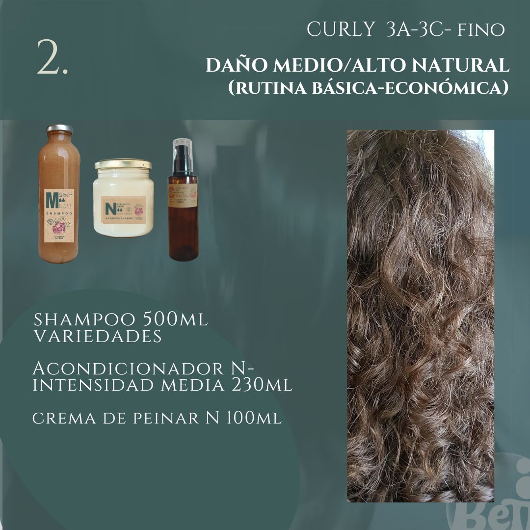 - 2. Cabello CURLY FINO DAÑO MEDIO Y ALTO (rutina básica-económica): Shampoo 500ml (elige variedad) + Acondicionador N Línea Clásica 230ml + Crema de Peinar N 100ml.
