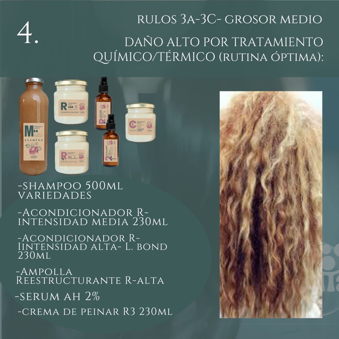 - 4. Cabello CURLY GROSOR MEDIO DAÑO ALTO TRATADO: Shampoo 500ml (elige variedad) + Acondicionador R Línea Clásica 230ml + Acondicionador R Línea BOND 230ml + Ampolla Reestructurante R + Serum AH 2% + Crema de peinar R3 230ml.