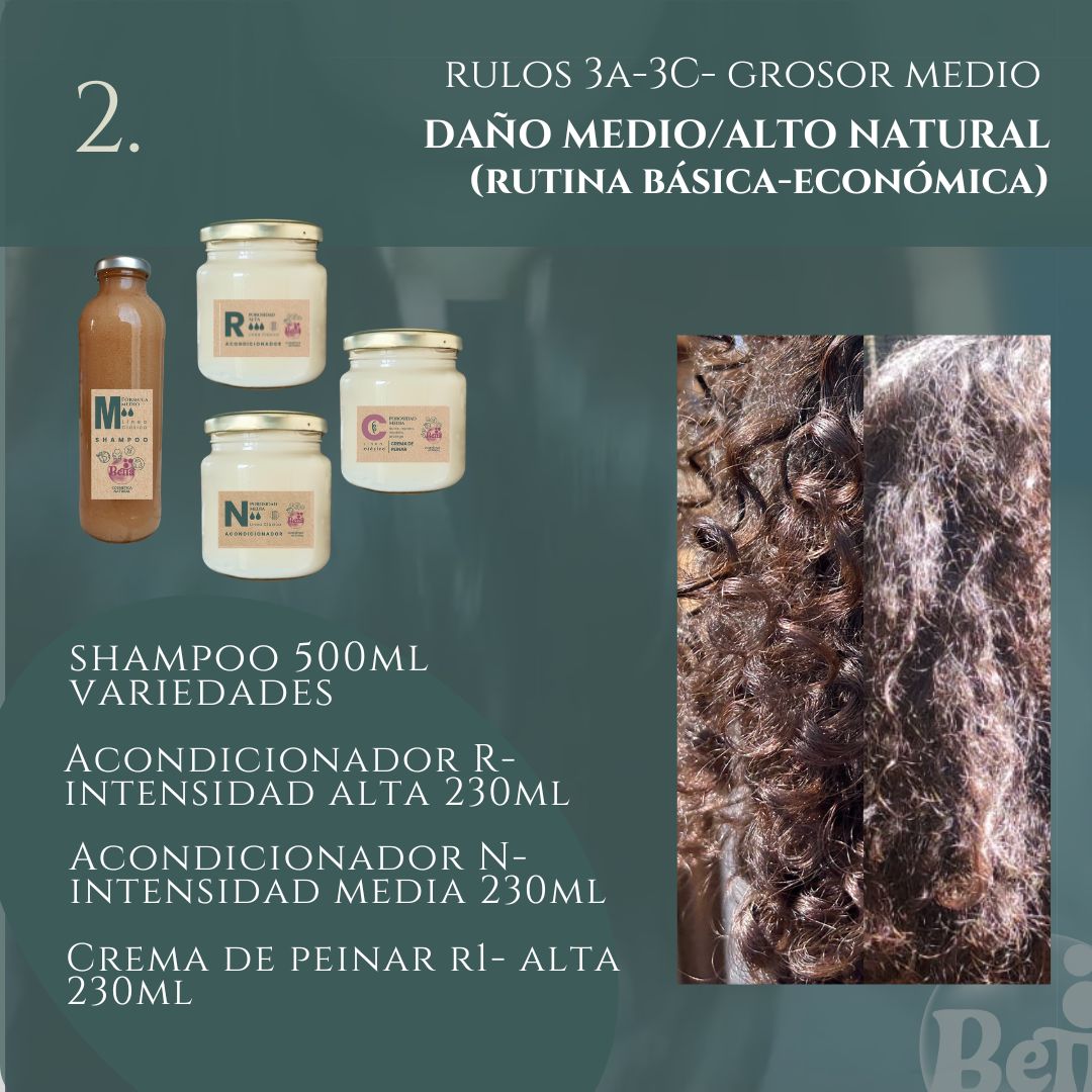 - 2. Cabello CURLY GROSOR MEDIO DAÑO MEDIO Y ALTO (rutina básica-económica): Shampoo 500ml (elige variedad) + Acondicionador N Línea Clásica 230ml + Acondicionador R Línea Clásica 230ml + Crema de Peinar R1 230ml.
